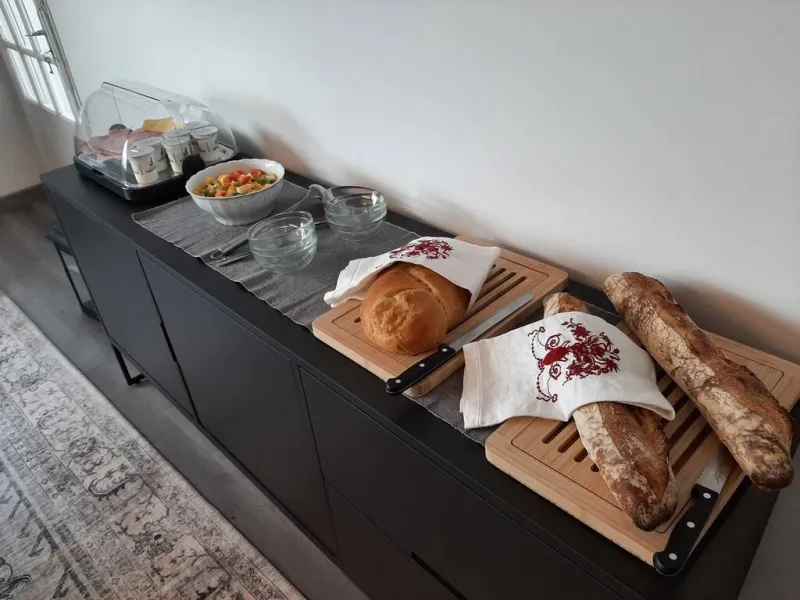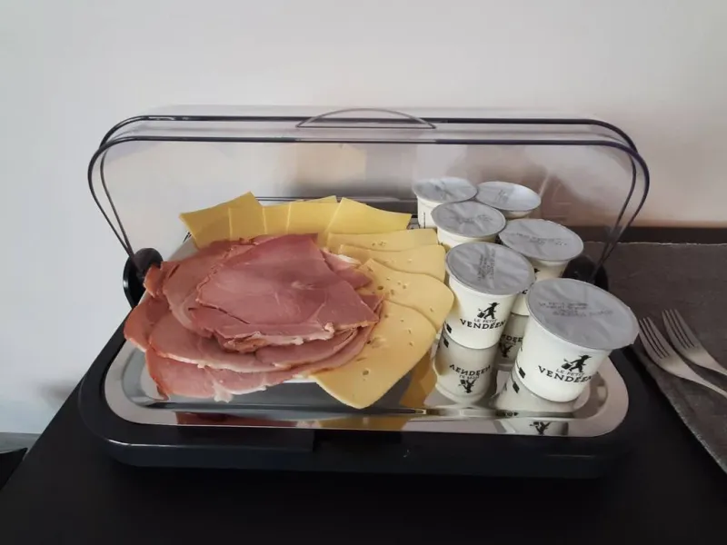 Le petit-déjeuner proposé est copieux et varié, baguette, viennoiserie, brioche avec une boisson chaude, mais également jambon et fromage pour ceux qui veulent du salé. Les gourmands y trouveront également une salade de fruits frais et des yaourts locaux.