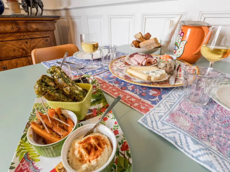 Table d'hôtes (20€/pers.), assiettes dînatoires (12€/pers.), planches apéritives (12€/pers.) et goûter (5€/pers.) sur réservation.