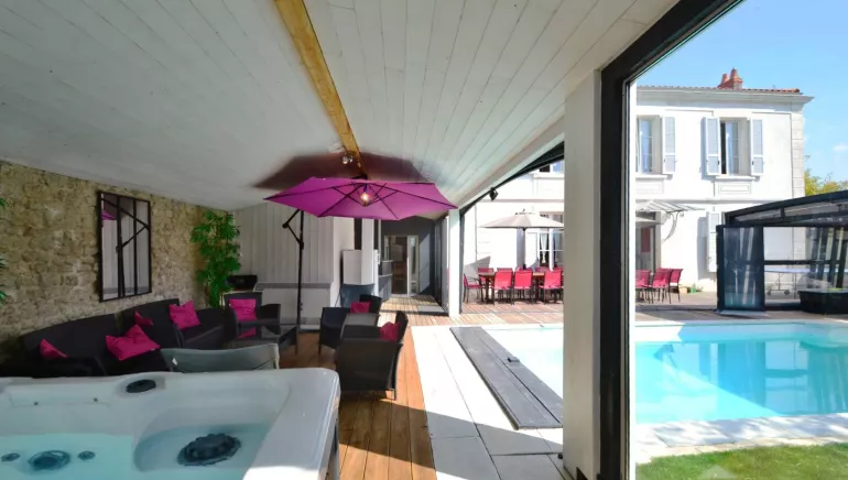 A l'extérieur: terrasse, ping-pong, espace pool house couvert comprenant: la piscine privée chauffée toute l'année à 29°, un spa privé chauffé toute l'année à 37°, une douche et WC indépendant, un comptoir bar et jeu de fléchettes. L'abri vélos sécurisé est mis à votre disposition. Le stationnement est privé et peux accueillir jusqu'à 4 véhicules, la cour est fermée.