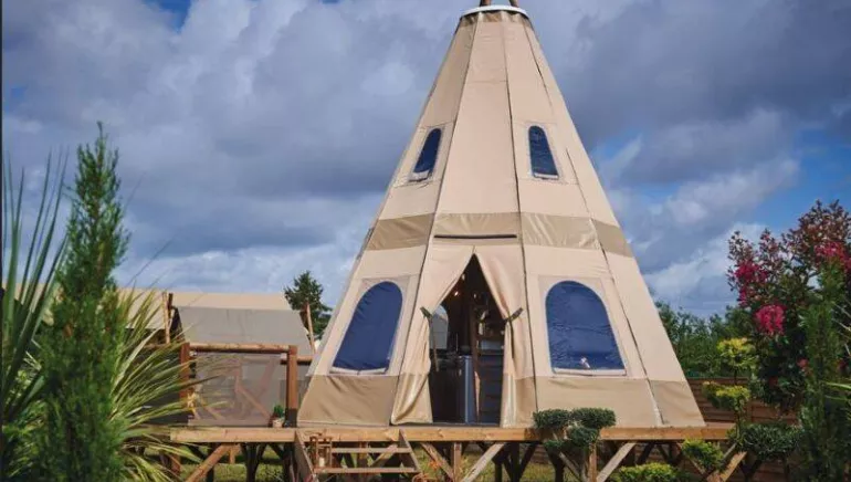 Venez découvrir la tente Tipi du Domaine du Roc ! Retrouvez vos rêves d’enfants grâce à ce logement atypique et équipé comme à la maison. Vous y trouverez une kitchenette tout confort, une chambre adulte et une chambre enfants à l’étage ainsi qu’une salle de bain équipée d’une douche, vasque et WC. Profitez également des services du camping (piscine couverte et chauffée, animations, location de vélos, canoës, pédalos et accrobranche). Nuitée possible hors juillet et août.