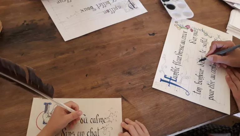 Plongez dans l’univers des scriptorium médiévaux lors d’un atelier mêlant art, histoire et nature. Guidés par la calligraphe Sylvie Forcioli, les participants découvrent les gestes ancestraux de la calligraphie et de l’enluminure, en utilisant des encres et peintures d’origine végétale.